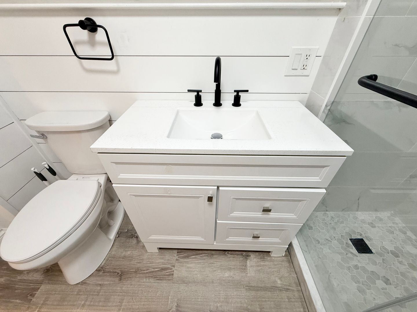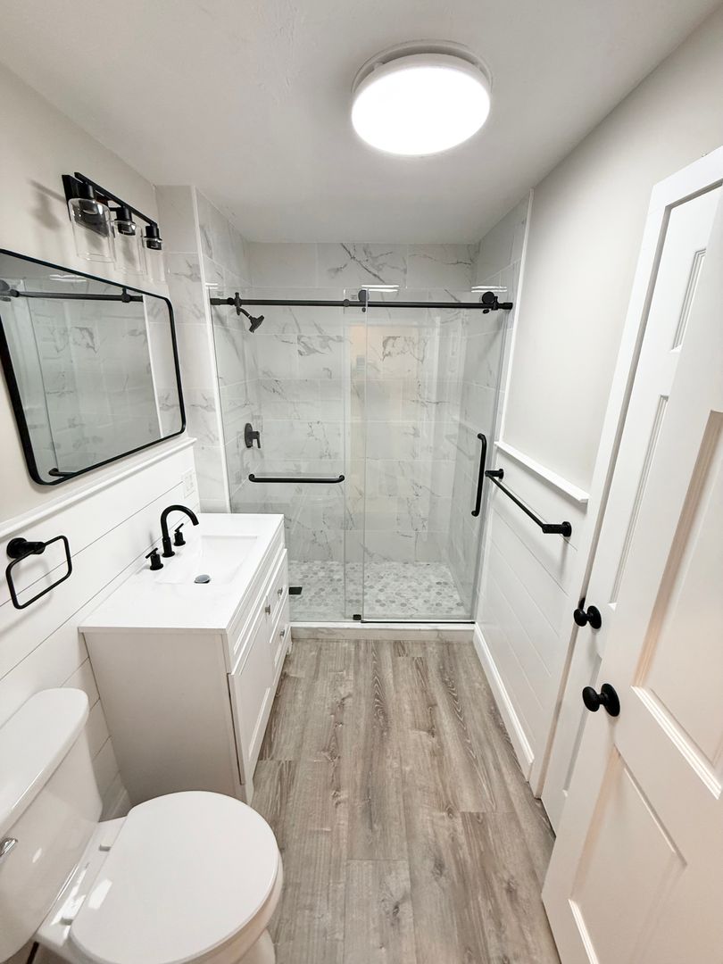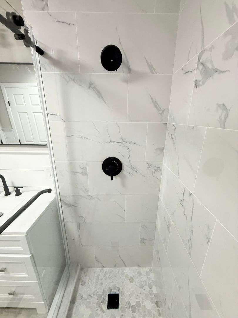 • Custom-tiled bathroom with glass shower